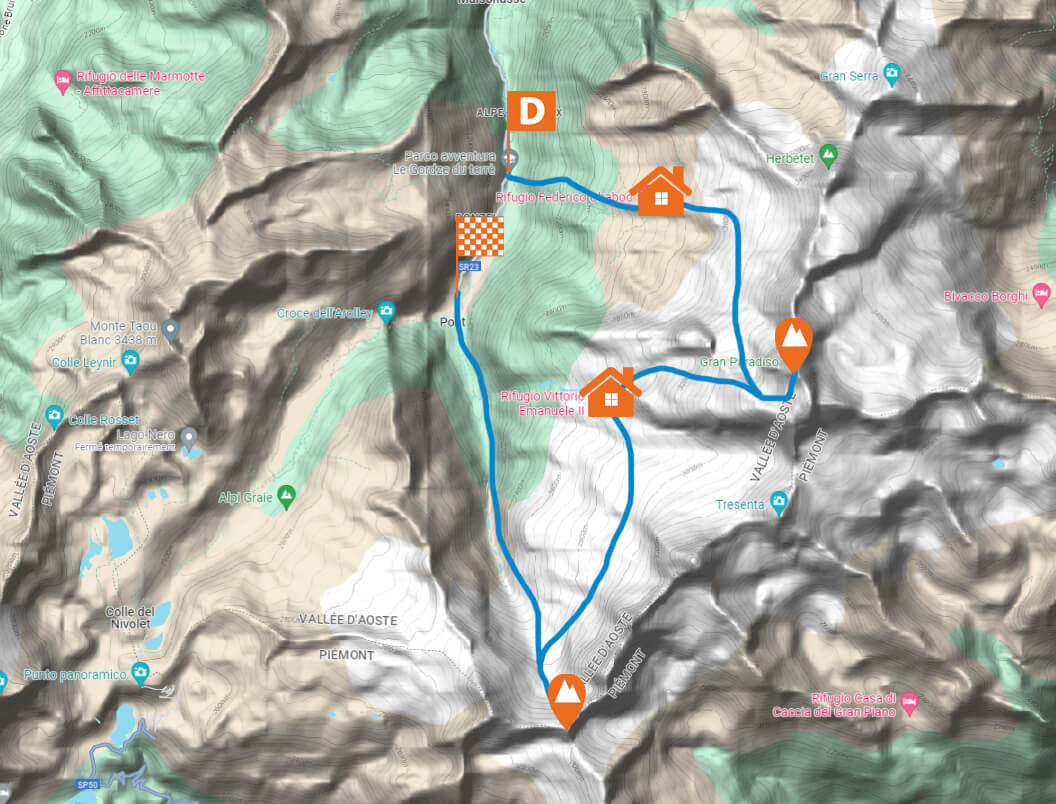 De Chabod (2 750 m) nous remontons la moraine qui surplombe le refuge puis nous obliquons vers le sud afin d’arriver sur le glacier Laveciau. Nous remontons le glacier jusqu’au Schiena d’Asino (3 600 m). Deux options s’offrent à nous. Soit redescendre directement sur le refuge Victor Emmanuel (2 732 m), soit poursuivre l’ascension du Grand Paradis (4 061 m) que nous atteignons encordés et crampons aux pieds. Une fois redescendu à la rimaye, nous chaussons les skis et redescendons au refuge Victor Emmanuel (2 732 m).